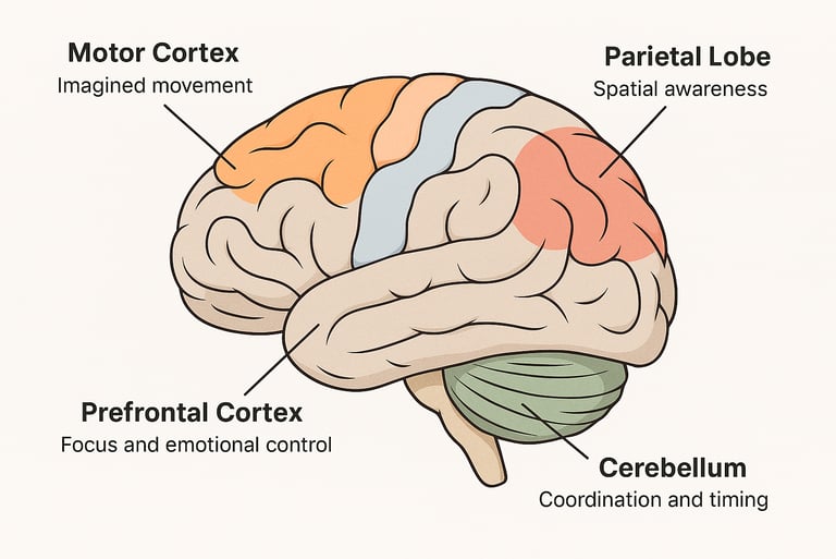 Visualization also engages areas of the brain involved in planning, focus, and emotional regulation, particularly the prefrontal cortex.